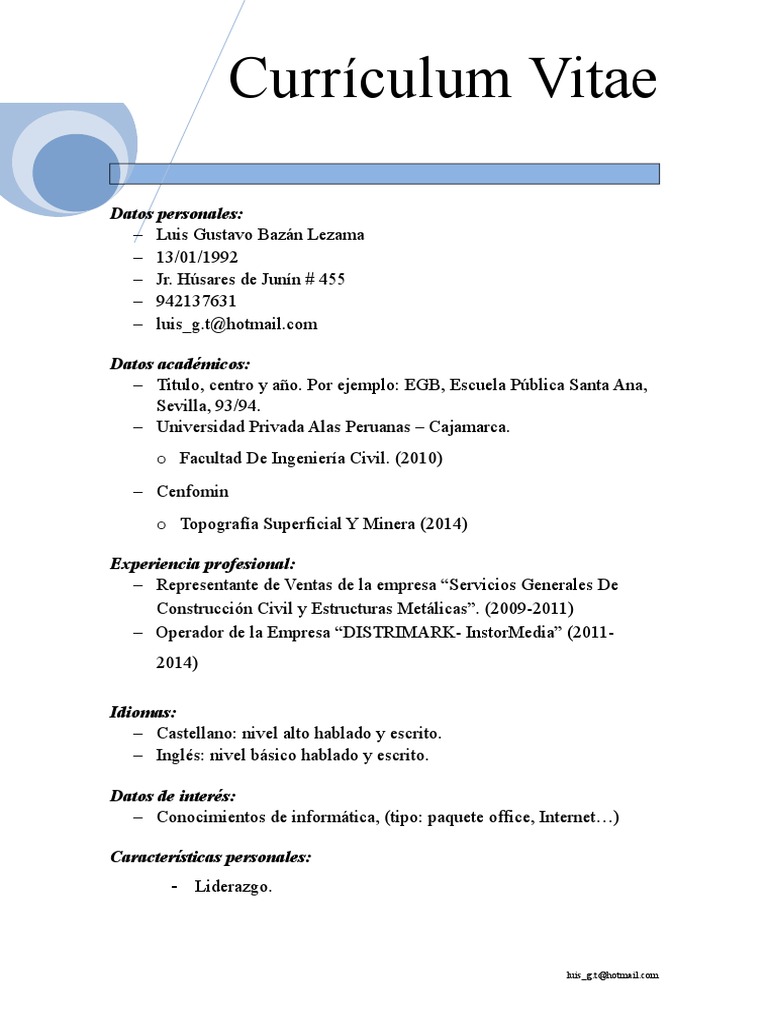 El curriculum vitae cumple una triple función: Yo te comparto en este día un poco de mi experiencia esperando que la tuya mejore. Si obtuviste algún título reconocido, como por ejemplo el 'first. Para que te resulte más sencillo puedes utilizar los siguientes ejemplos de curriculum vitae. Es muy importante tomarse el tiempo para trabajar en tu currículum.